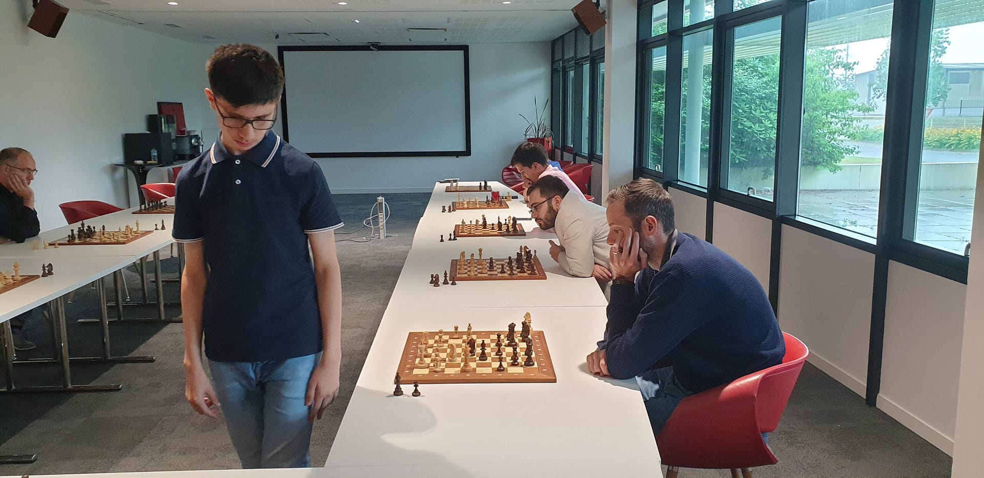 C’est Ali, notre champion de Bretagne jeune, qui affrontait 9 joueurs de Suravenir. Ces joueurs, soit disant débutants, étaient en réalité d’un bon niveau, et ils auraient tous pu joueur dans les équipes adultes de Brest, en particulier deux d’entre eux, dont le niveau réel était proche de 1800.